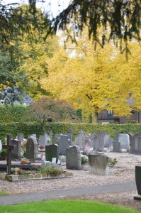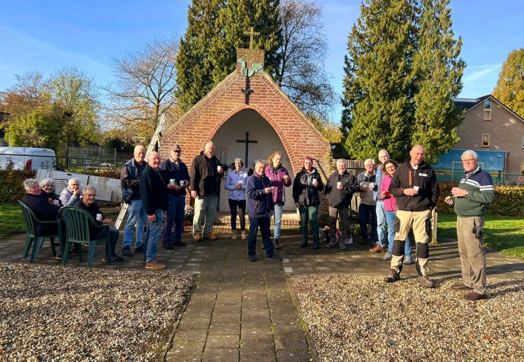 Zaterdag 1 november, de regen kwam gestaag naar beneneden, en toch, maar liefst 18 vrijwilligers die getooid met (gesponsorde) regenjassen druk bezig gingen met blad blazen en opruimen, vegen, harken, onkruid wieden, het columbarium uitsoppen, het toegangshek aanslagvrij maken enz. enz. Uiteraard ruim tijd voor koffie, met (ook gesponsorde) koeken, waarvoor vanuit alle vrijwilligers weer hartelijk dank! Rond half 11 hield het op met zachtjes regenen en werd er snel opgeruimd en ging een ieder met een voldaan gevoel en natte kleding huiswaarts.