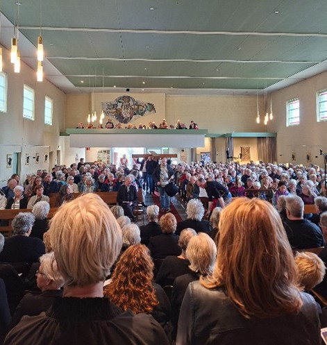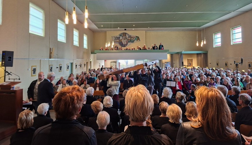 “In deze onzekere tijden zijn mensen meer dan ooit doordrongen van het feit dat je het niet alleen kunt. Verdriet en leed kan verzacht worden als je het mag en kunt delen met anderen. Het enorme lijden van mensen die getroffen worden door de huidige oorlogen, dat mogen we niet normaal gaan vinden. We mogen niet wegkijken ook al voelen we ons machteloos. We worden gevraagd elkaar te helpen het kruis te dragen. In de viering van de Passie werd dat heel krachtig verwoord: “De wereld schreeuwt, vraagt om een Simon van Sirene. Simon was er om Jezus het kruis te helpen dragen. De wereld is vol leed. Al dat leed slaat ons lam, we staan langs de weg en kijken toe! Wie doet er een stap naar voren zoals Simon? Wanneer staan we op om het leed van de gekruisigde mensen, kinderen te helpen dragen”. Het lied, “Laat hen niet alleen”, dat op deze tekst volgde was een oproep om er voor de kinderen In Gaza, Oekraïne en Soedan te zijn en hen een toekomst te geven. Met dit lied werd de boodschap van het levens- en lijdensverhaal van Jezus”, heel krachtig weergegeven.