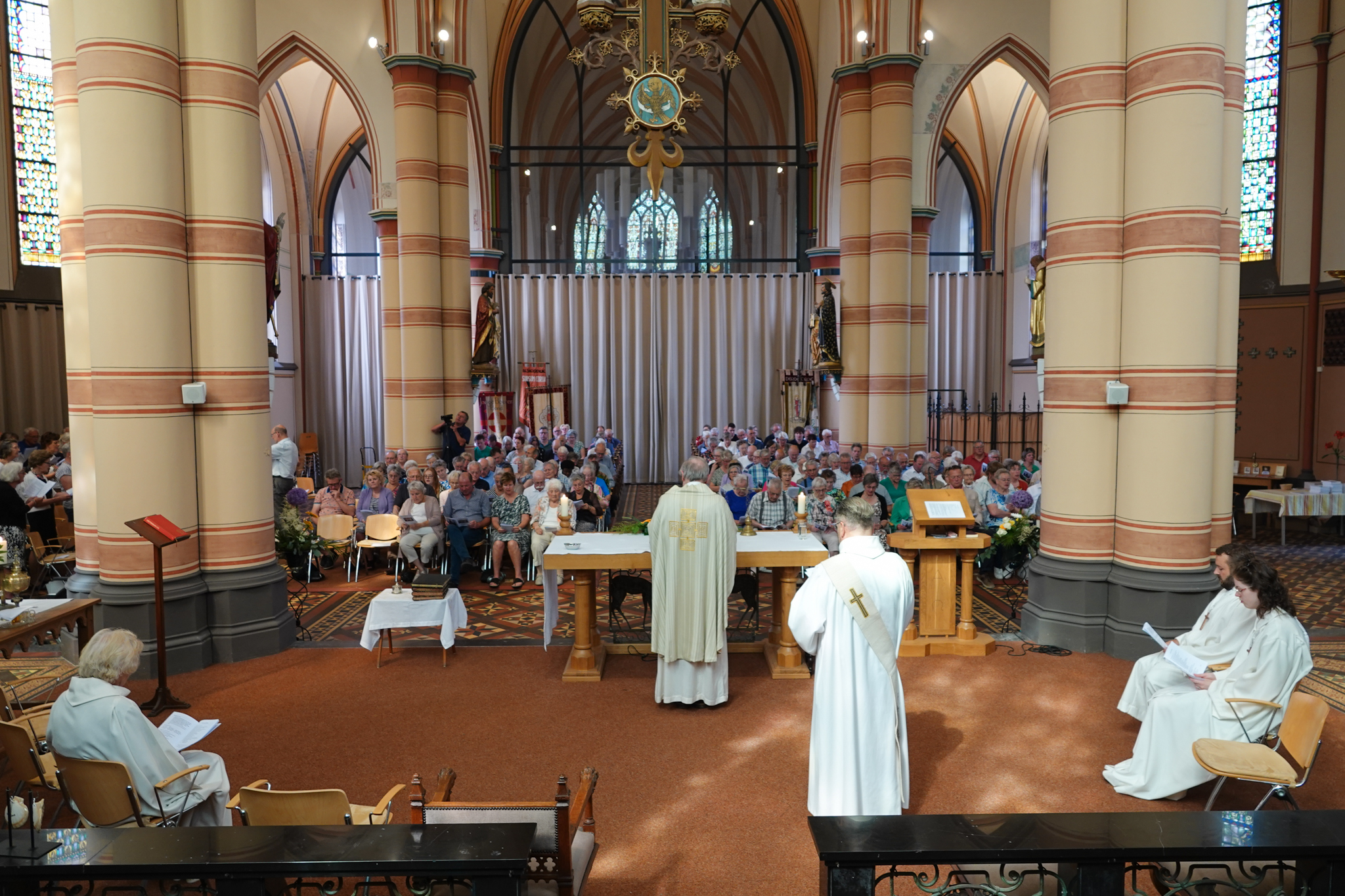 Velen van u zullen reeds gelezen hebben wat de plannen van de nieuwe eigenaar zijn. De nadruk zal komen te liggen op klassieke (orgel)concerten. Maar daarnaast is het mogelijk om de kerk voor een dag te huren. Dat betekent dat we in de kerk een afscheidsbijeenkomst van een overledene kunnen houden. Daarvoor hebben we een aantal attributen veilig gesteld. De grote kledingkast die achter in de kerk stond is verplaatst naar de kerkhofkapel. De rouwtogen zijn in die kast in de kerkhofkapel opgeborgen. Mocht u in de toekomst een uitvaart vanuit de kerk wensen dan zijn de mogelijkheden ruimer dan voorheen. De kerk is geen heilige grond meer. Het kan dus een afscheidsbijeenkomst zijn maar er kan ook een Katholieke uitvaart plaatsvinden. Dit is dan wel altijd een gebedsdienst waar de voorgangers van onze parochie de Twaalf Apostelen in voor kunnen gaan en aan het einde van de viering kan een absoute (een ritueel waarbij de voorganger de kist met wijwater besprenkelt en bewierookt, onder het uitspreken van begeleidende gebeden) een laatste eerbetoon aan het lichaam van de overledene. Daarnaast is het mogelijk om de kerk te huren voor een huwelijk, dat zal dan geen kerkelijk huwelijk worden, maar de ambtenaar van de burgerlijke stand mag wel een huwelijk voltrekken in de kerk. Ofwel door het onttrekken van de eredienst zijn er voor mensen die de kerk wel een mooi gebouw vinden in de toekomst mogelijkheden. Vanaf wanneer de kerk te huur is zullen we u zo spoedig mogelijk laten weten, denk aan het voorjaar van 2024.