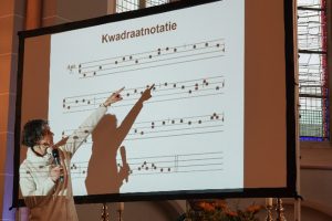 Voorafgaand aan de Maria Vespers konden geïnteresseerden een workshop van Hanneke van der Grinten volgen over het Gregoriaans zingen. De belangstelling hiervoor was groot; ruim 70 mensen hadden zich voor de workshop aangemeld. Op een aanstekelijke en gepassioneerde manier vertelde Hanneke van der Grinten over de geschiedenis van het Gregoriaans, de notatie, en de interpretatie van tekst en noten. Tot slot oefende zij met de deelnemers in het Gregoriaans zingen van enkele korte stukken die de deelnemers in de Vespers konden meezingen.