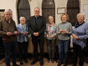 Dit was een onvergetelijke werkgroep binnen de geloofsgemeenschap en zo heeft Pastoor Zemann samen met parochieel medewerkster Gerry Spekkink de leden Fons Stapelbroek, Paulien Gasselink, Francie Wicherink, Annelies de Vrught en Maria Kemp (helaas afwezig) een oorkonde en plaquette overhandigd voor hun inzet binnen de parochie HH12 apostelen.